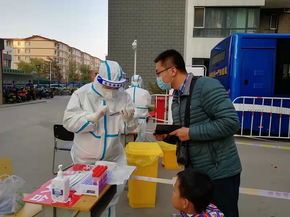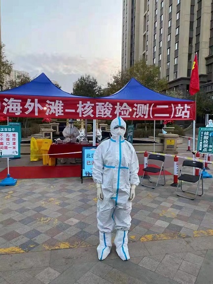 集團宣傳部翟玉卿參加金漢御園小區(qū)核酸檢測志愿服務。