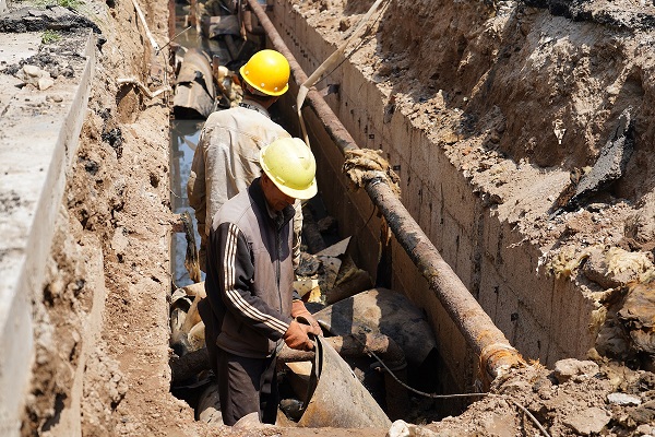 開(kāi)天花園小區(qū)施工直播結(jié)束后,我們直播組直奔如意小區(qū)供熱二次管網(wǎng)改造的施工現(xiàn)場(chǎng)。循著一陣陣的臭味,我們來(lái)到了如意小區(qū)的A區(qū)一幼兒園后面,映入眼簾的是正在抽排污水的地溝,地溝中的供熱管線距污水水面非常近,污水在炎熱天氣的發(fā)酵下,臭氣熏天。工人們正在深溝里進(jìn)行排污及淤泥清理工作,每一個(gè)動(dòng)作都顯得格外艱難,衣服幾乎和污水一個(gè)顏色。