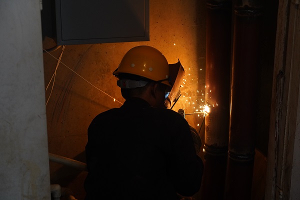 上午9:30時(shí),直播組來(lái)到開(kāi)天花園北區(qū)1號(hào)樓前,小區(qū)供熱主線的管溝內(nèi),一工人師傅穿著長(zhǎng)褂,帶著手套在狹小的空間內(nèi)正嫻熟地進(jìn)行焊接,飛濺的火花下面,看不清楚他的臉,待焊接完一段后,他取下電焊面罩,露出一張黑紅黑紅的臉,汗水順著額頭直瀉而下,汗珠吧嗒吧嗒流在眼里、滴到了地上,不時(shí)用衣袖擦眼睛。他告訴筆者,地面溫度是36°,他焊接的周邊溫度要達(dá)到50多度。面對(duì)高溫的"烤"驗(yàn),他全然不顧,用他的話說(shuō):這是他們的工作常態(tài),早已習(xí)慣。